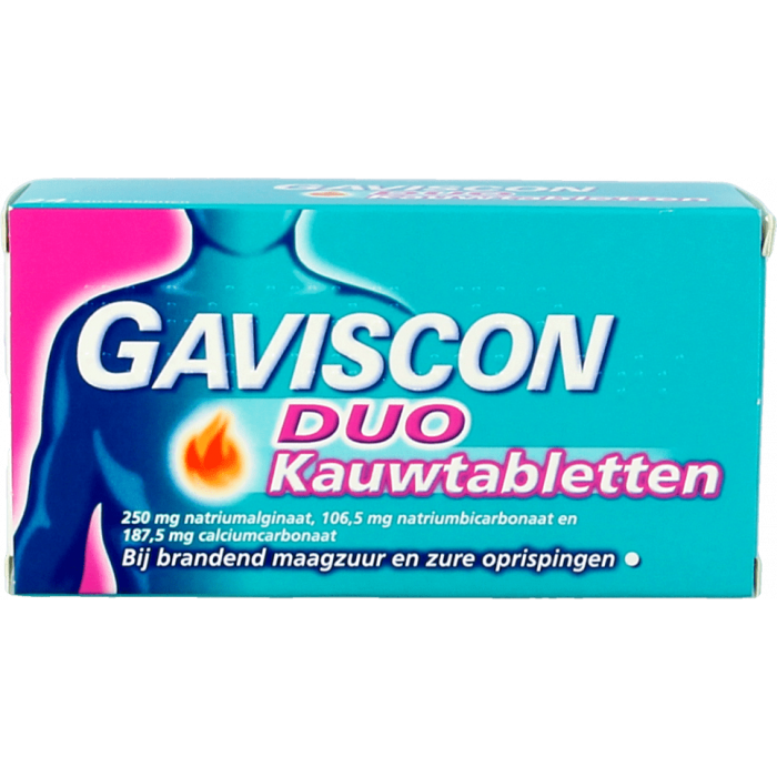 Gaviscon Duo Kauwtablettenzijn een combinatie van twee maagzuurneutraliserende middelen (calciumcarbonaat en natriumbicarbonaat) en een alginaat. De tabletten hebben een dubbele werking: